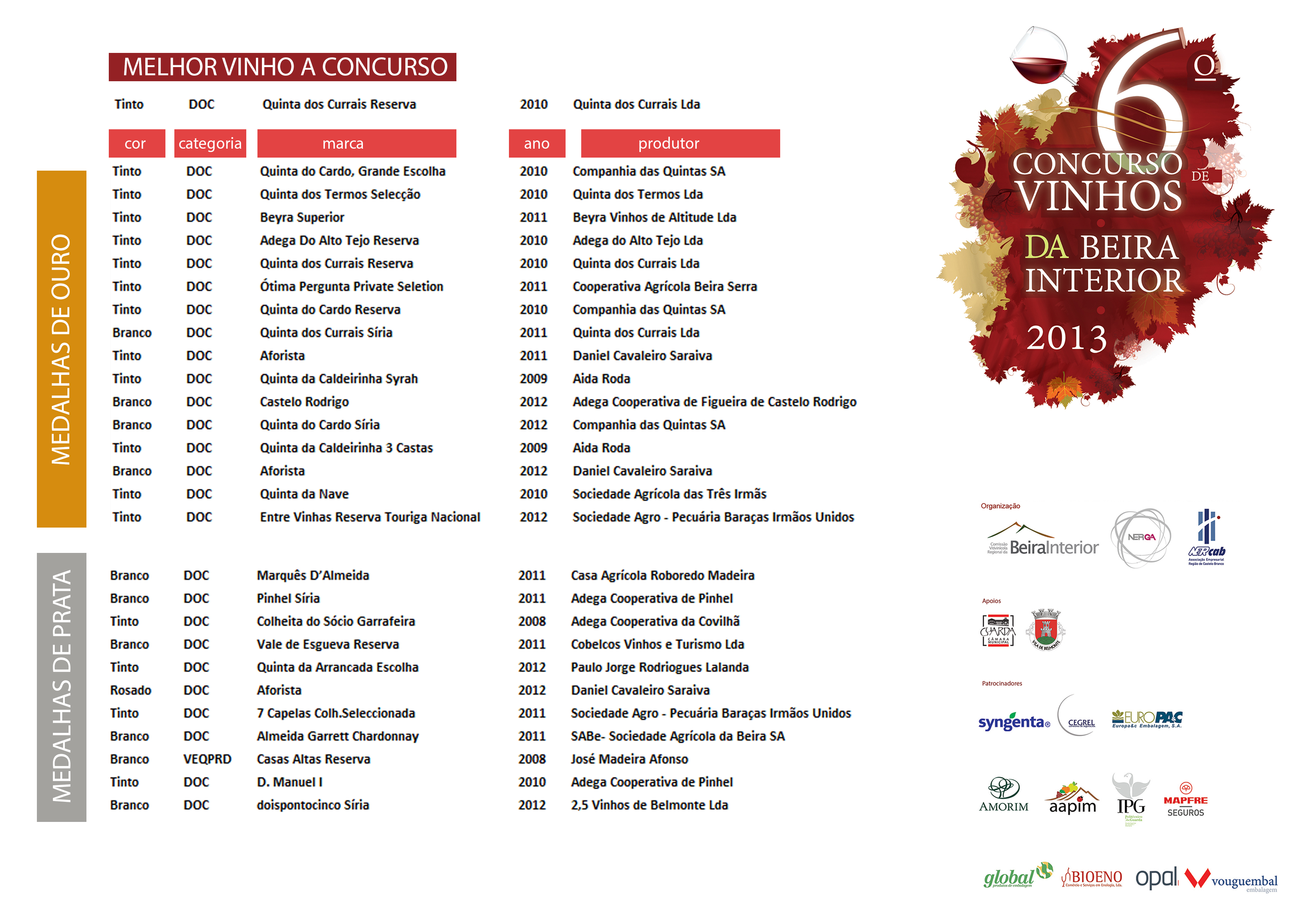 Na Gala de entrega de prémios o destaque maior foi para o Vinho Quinta dos Currais Reserva Tinto DOC Beira Interior de 2010 que arrecadou o prémio de melhor vinho a concurso.