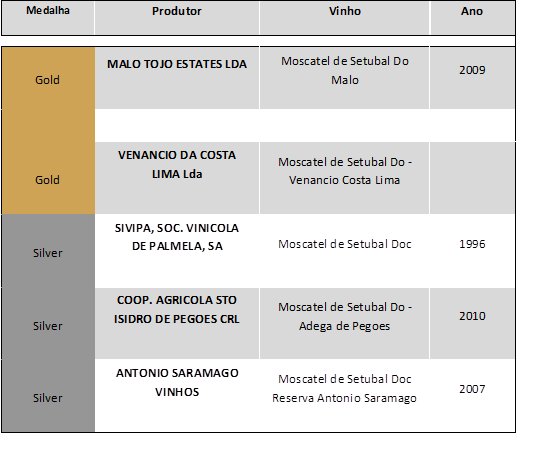 Na edição de 2011 foi o Moscatel de Setúbal Reserva 2006, da empresa Venâncio da Costa Lima, que recebeu o título de "Melhor Moscatel do Mundo", este ano o seu sucessor é um moscatel espanhol - BTL Lanzarote. Os Moscatéis de Setúbal continuam a liderar os vinhos portugueses galardoados no concurso, das sete medalhas lusas 5 são para Moscatéis de Setúbal - Malo Tojo Estates, 2009, DO Setúbal (medalha de ouro); Venâncio da Costa Lima, DO Setúbal (medalha de prata); SIVIPA, 1996, DO Setúbal (medalha de prata); Adega de Pegões, 2010, DO Setúbal (medalha de prata); Reserva António Saramago, 2007, DO Setúbal (medalha de prata).